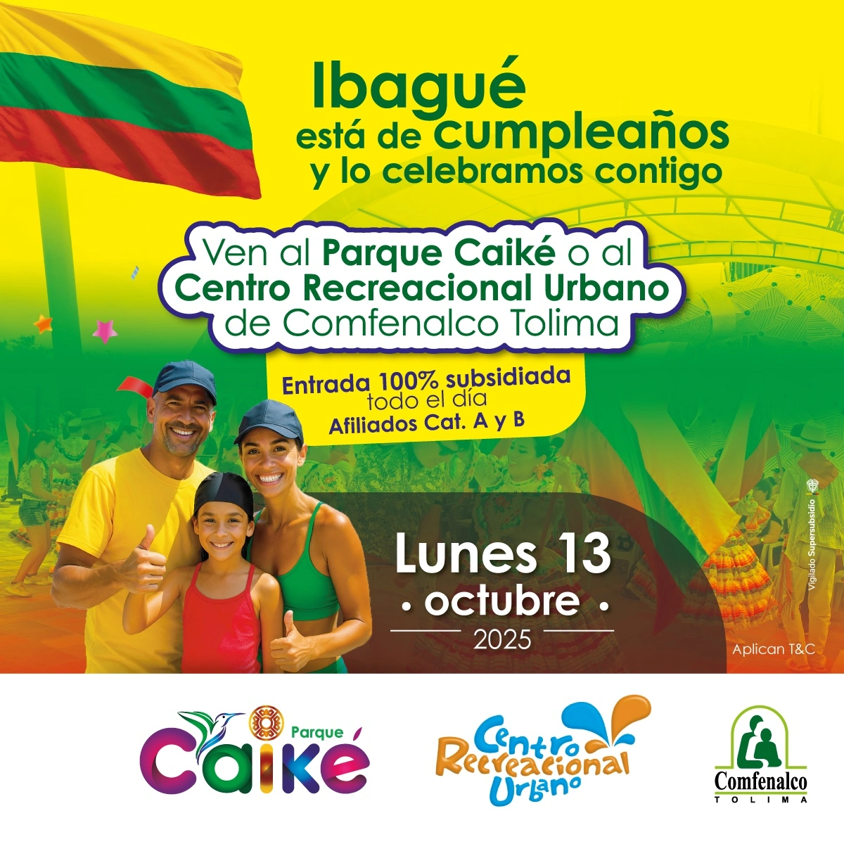Celebra el cumpleaños de Ibagué: ingreso sin costo a Caiké y al Centro Recreacional para afiliados A y B